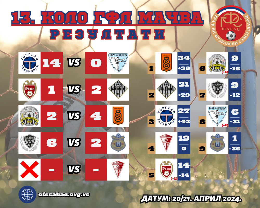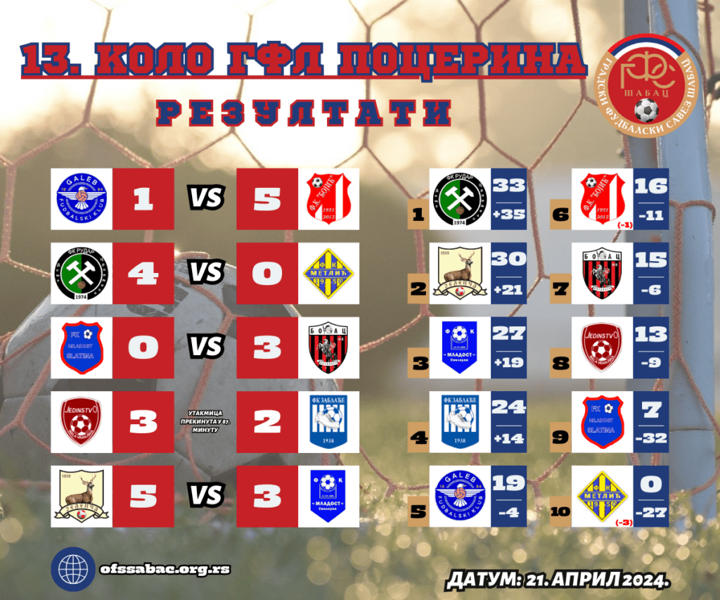 У оквиру ове вести можете видети резултате 13. кола градских фудбалских лига Шабац – Мачва и Поцерина. Најаву кола могли сте да прочитате ОВДЕ.