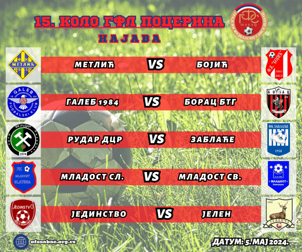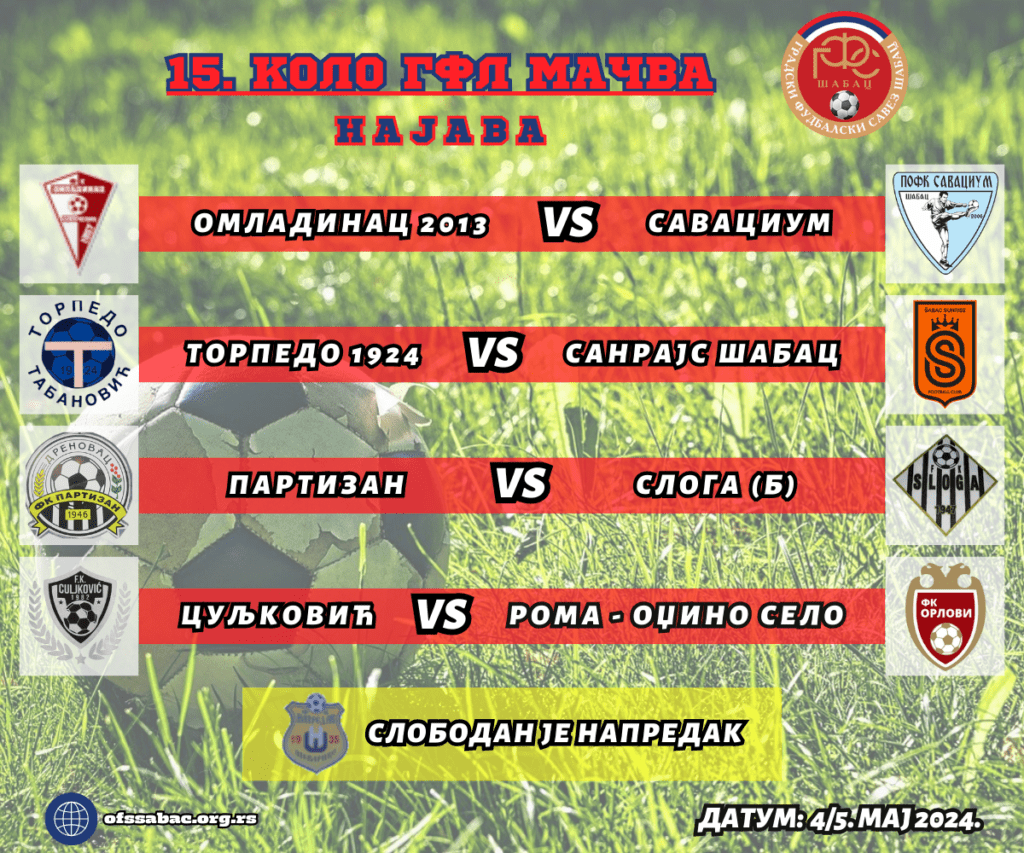 Као што је поменуто, Партизан и Слога отварају коло у суботу са почетком у 17 часова. Све остале утакмице 15. кола играће се у недељу од стандардних 11 часова. Планове за празник неометано је могао да прави колектив Напретка из Шеварица који је слободан у Мачви.