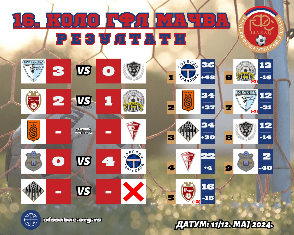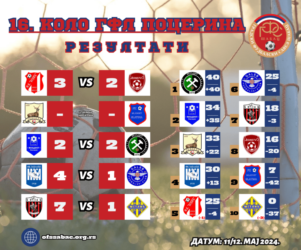 У оквиру ове вести можете видети резултате и табеле након 16. кола градских фудбалских лига Шабац – група Мачва и Поцерина. Најаву кола могли сте да прочитате ОВДЕ.