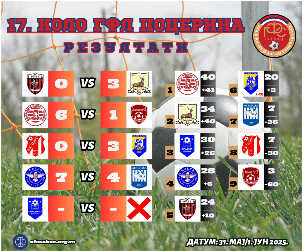 У оквиру ове вести можете видети резултате и табеле након утакмица ГФЛ Шабац које су одигране 31. маја/1. јуна. Најаву кола могли сте да прочитате ОВДЕ.