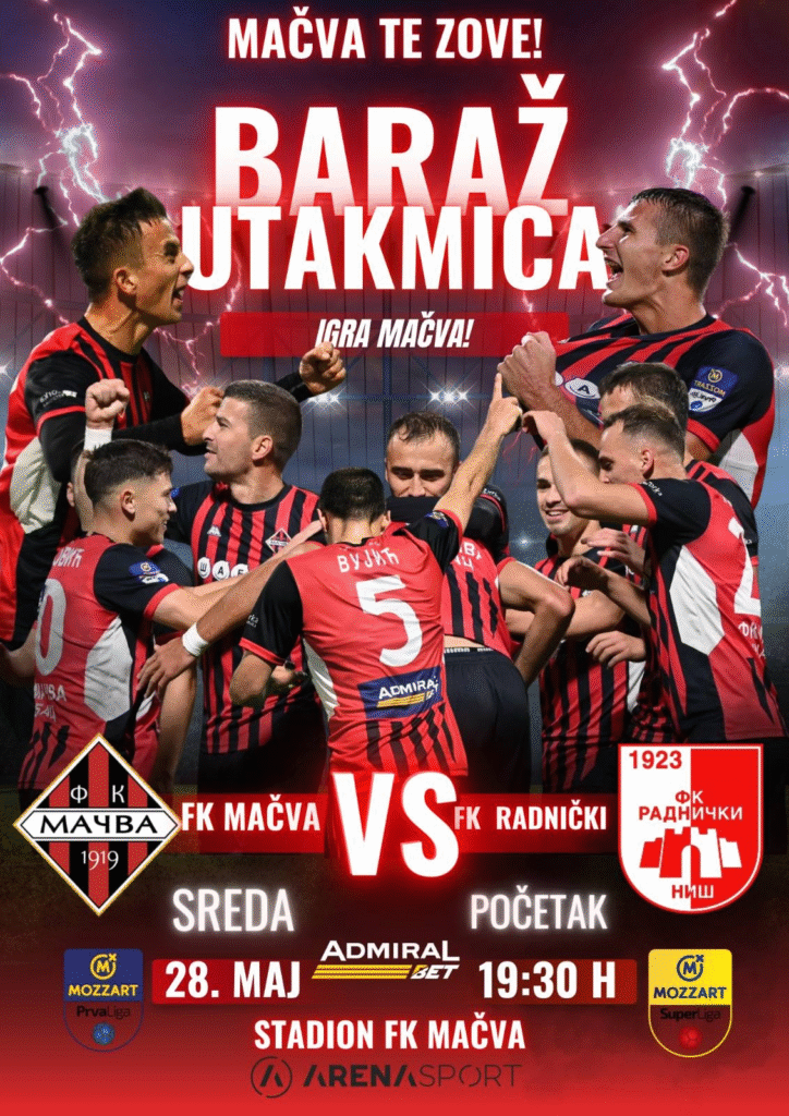 У среду, 28. маја са почетком у 19.30 часова, на стадиону у Шапцу, фудбалери Мачве угостиће Раднички из Ниша у првој утакмици баража за пласман у Моцарт Бет Супер лигу Србије.