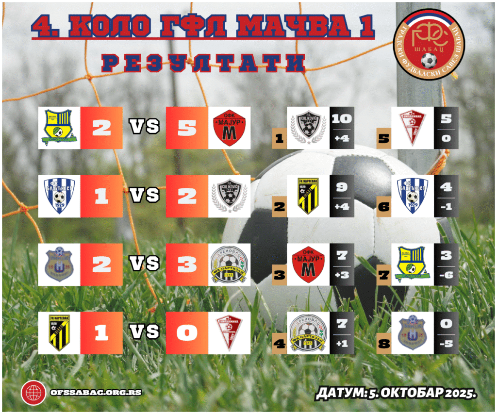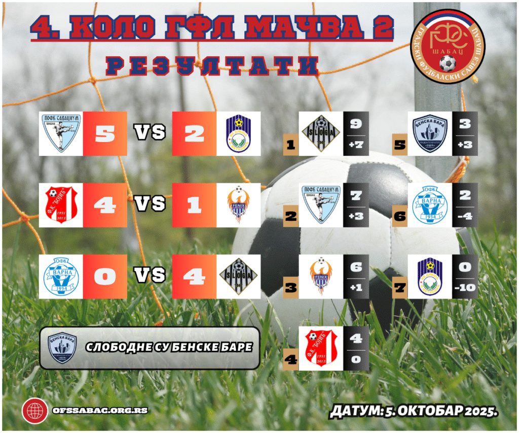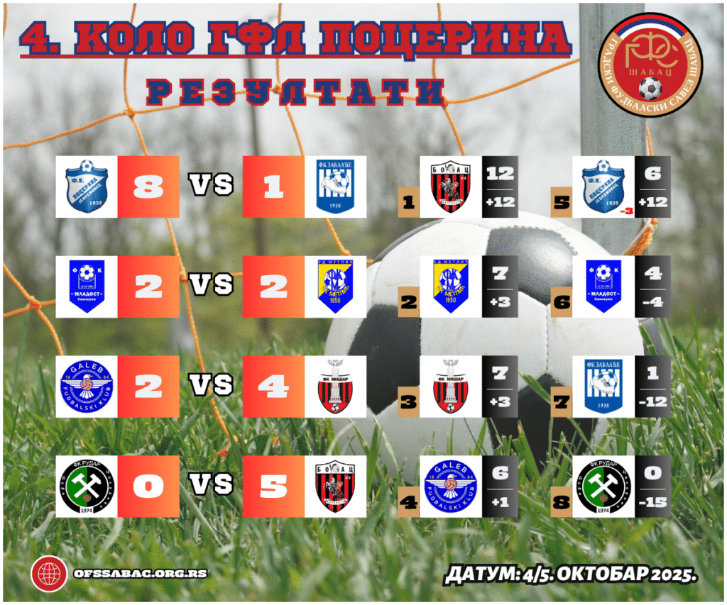 У оквиру ове вести можете видети резултате и табеле након утакмица 4. кола ГФЛ Шабац које су се играле 4/5. октобра. Најаву кола могли сте да прочитате ОВДЕ.
