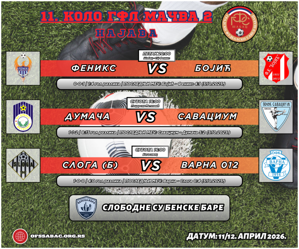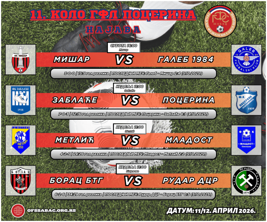 Пред нама је 11. коло Градске фудбалске лиге Шабац, што значи да су до краја регуларног дела првенства преостала још само четири кола, након којих ће бити познати учесници плеј-офа.