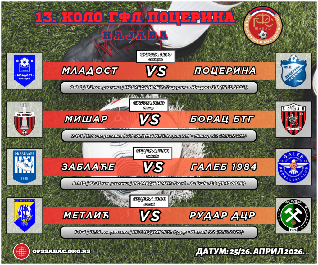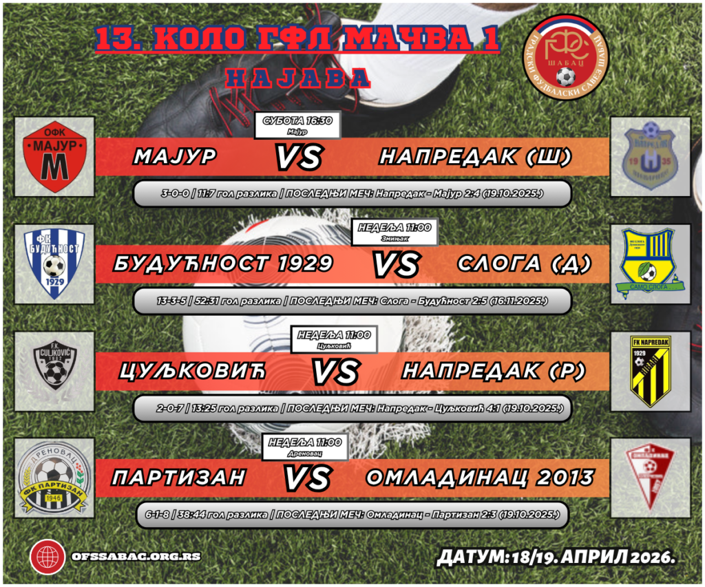 Пред нама је претпоследње коло регуларног дела сезоне градских фудбалских лига Шабац. Трка за плеј-оф улази у финиш, а како се сви бодови преносе у наредну фазу разигравања, предстојећих 180 минута фудбала имају огромну тежину за све тимове који претендују на виши ранг.