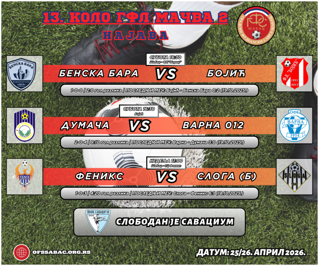 У групи „Мачва 2“ издваја се сусрет у Шапцу где лидер Феникс дочекује водећу Слогу. Екипа Слоге је у првом делу сезоне доминирала у овом дуелу славивши са убедљивих 6:1, па ће домаћи сигурно имати мотив да се реванширају, као што су то већ чинили против неких других противника. Након успешног гостовања у Бојићу, Думача у новом комшијском сусрету дочекује екипу Варне, у мечу који увек доноси посебан набој. Бенска Бара на свом терену дочекује Бојић, са јасним циљем да освоји нове бодове пре одласка у плеј-оф, док је екипа Савациума слободна у овом колу.